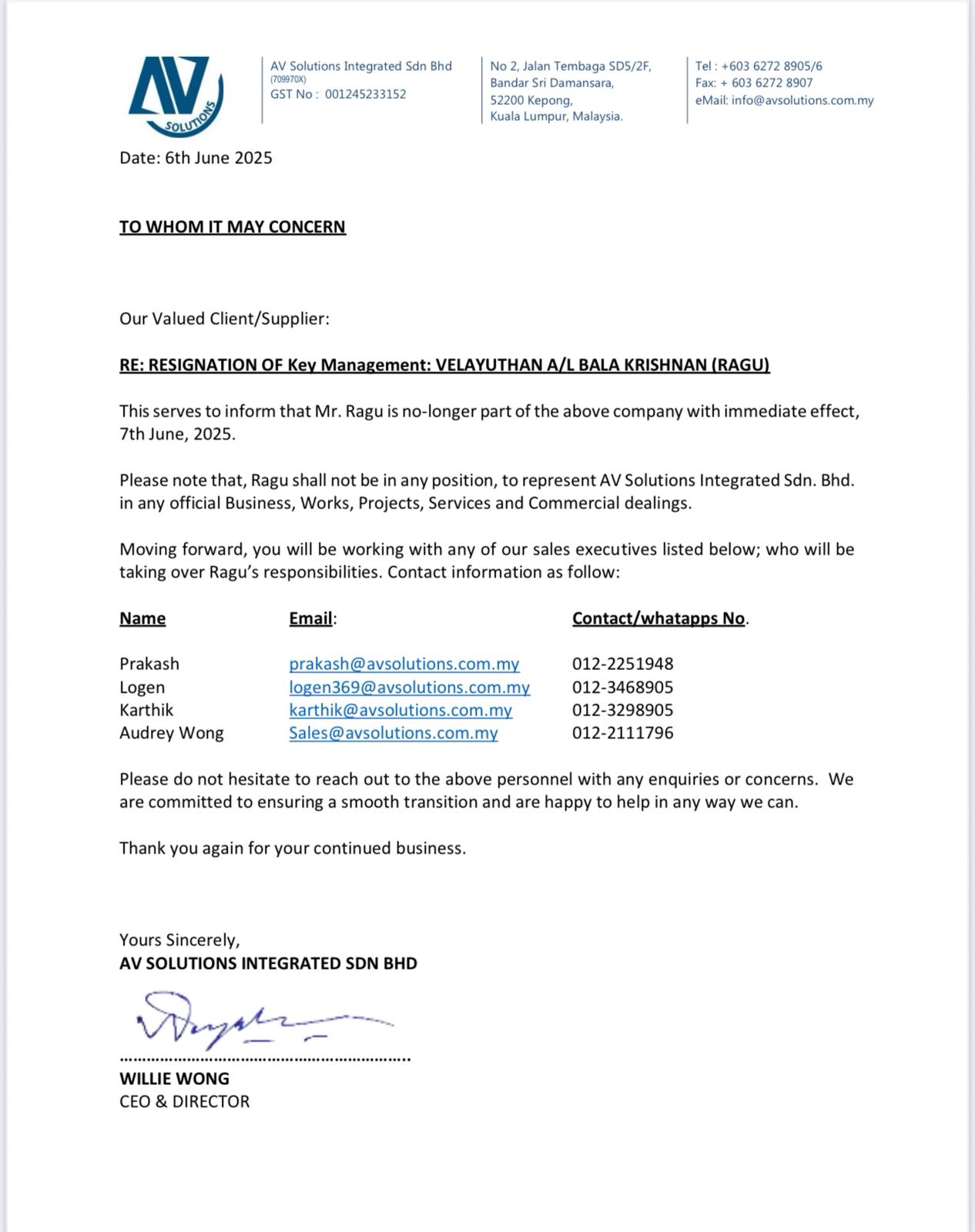 Date: 6th June 2025 TO WHOM IT MAY CONCERN Our Valued Client/Supplier: ...